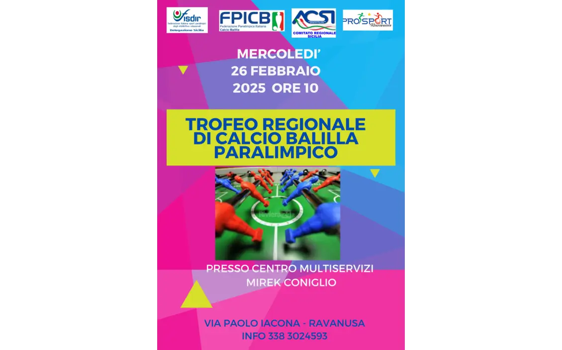 Manifestazione indetta dalla Federazione Paralimpica Italiana di Calcio Balilla, organizzata dalla Pro Sport Ravanusa con la collaborazione dell’ACSI Sicilia e dalla delegazione della FISDIR Sicilia.